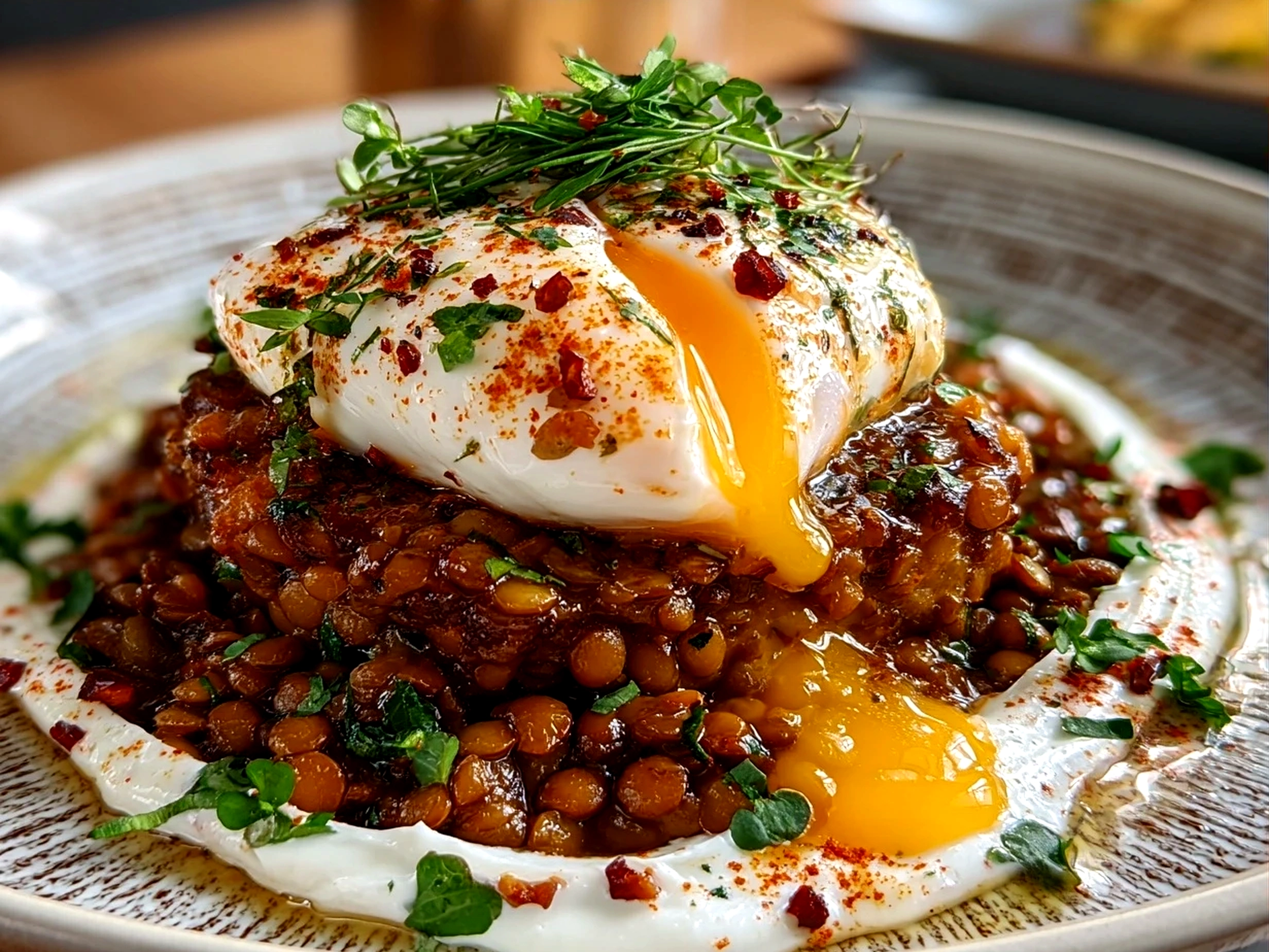 A wholesome and flavorful dish featuring earthy lentils topped with a perfectly poached egg and creamy yogurt, combining protein and probiotics in one satisfying meal.