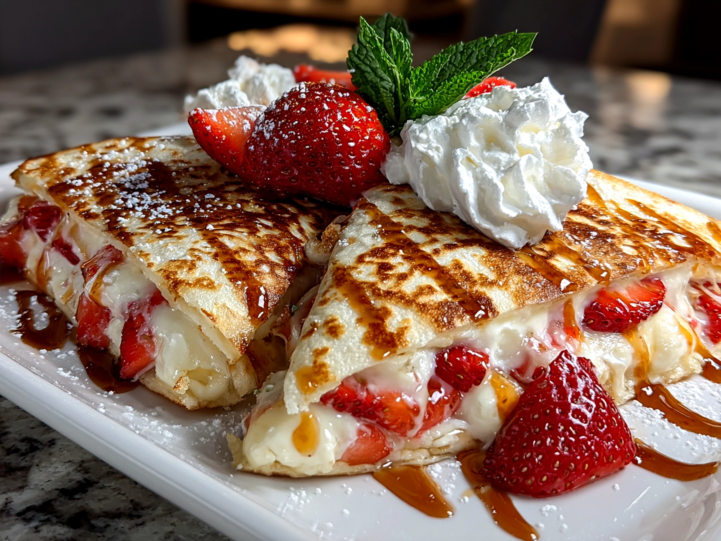A deliciously sweet and creamy twist on the classic quesadilla, featuring fresh strawberries and rich cheesecake filling perfectly grilled between warm tortillas.